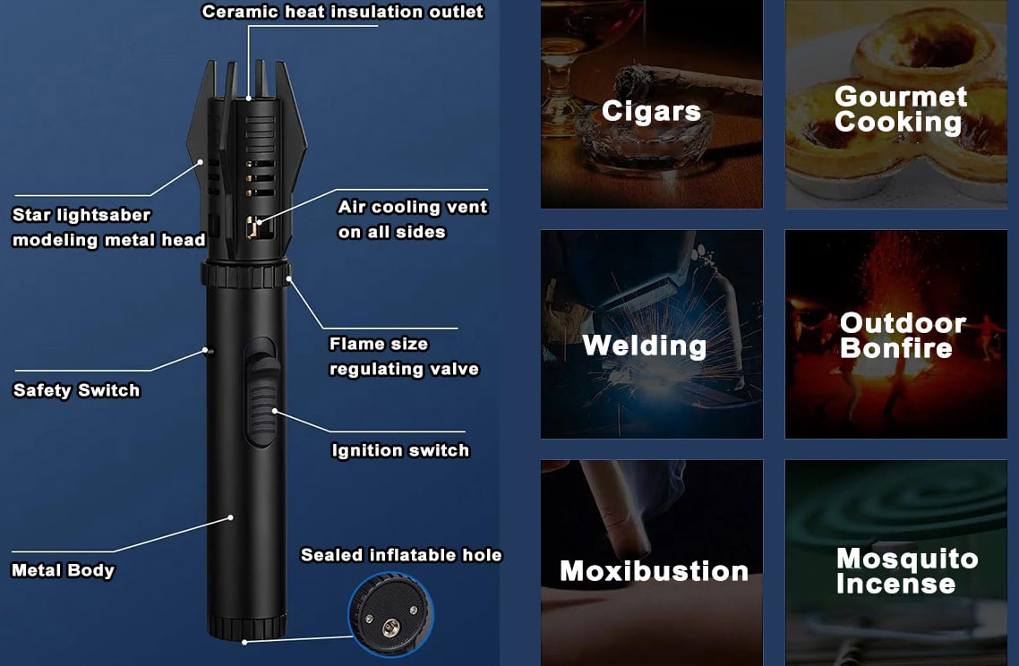 ROTARY ADJUSTABLE FLAME SIZE - With a simple twist, users can adjust the flame size, making it suitable for a wide range of tasks. Whether you need to light a cigar, perform welding work, enjoy outdoor activities, this multifunctional lighter is up to the task.