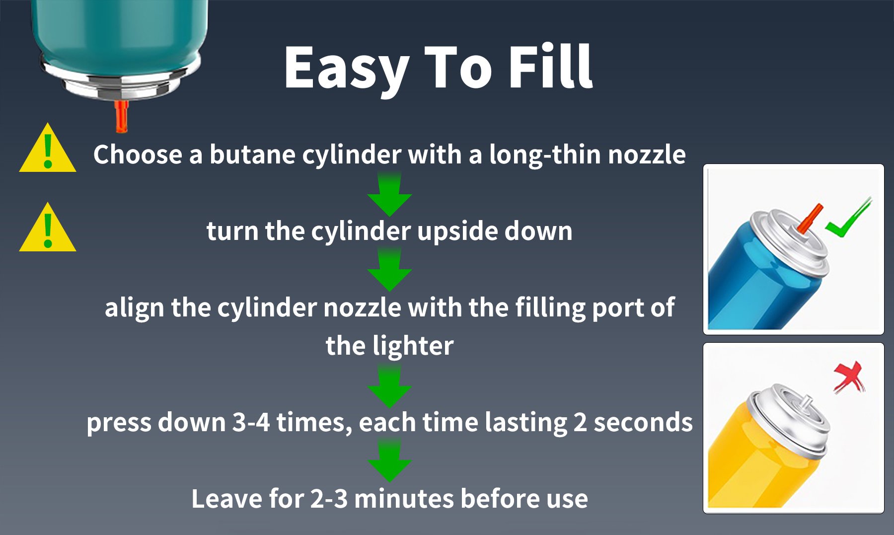 TIP - Due to transportation restrictions, the lighter does not contain butane and needs to be filled by yourself after receiving the goods.