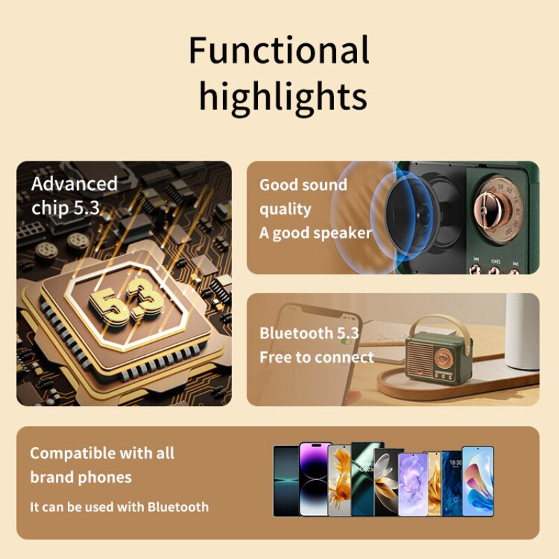 This small, portable retro speaker is equipped with an advanced 5.3 chip to ensure excellent sound quality and is equipped with high-quality speakers. It is compatible with all brands of mobile phones and supports Bluetooth 5.3 connection for a seamless and convenient wireless playback experience.
