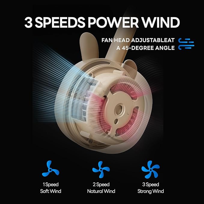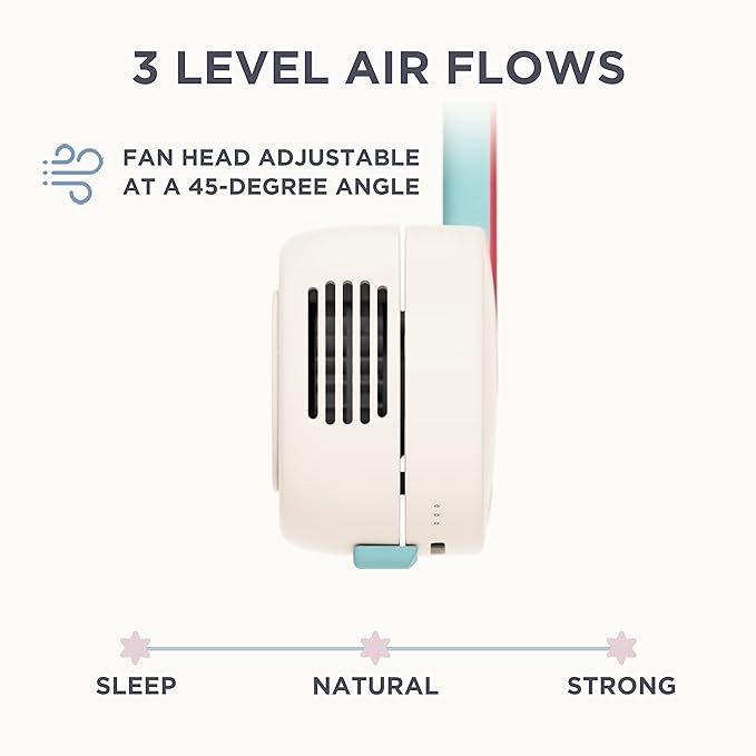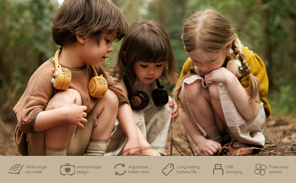 The USB fan provides 3 wind speeds: natural, medium, and strong. Neck fan designed for headphones. Quickly cool down your child anytime, anywhere.Made from soft, high-quality silicone and weighing approximately 9 ounces, it's ultra-light and puts no pressure on your neck, making it comfortable to wear. The hands-free design makes the portable neck fan ideal for outdoor activities.